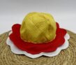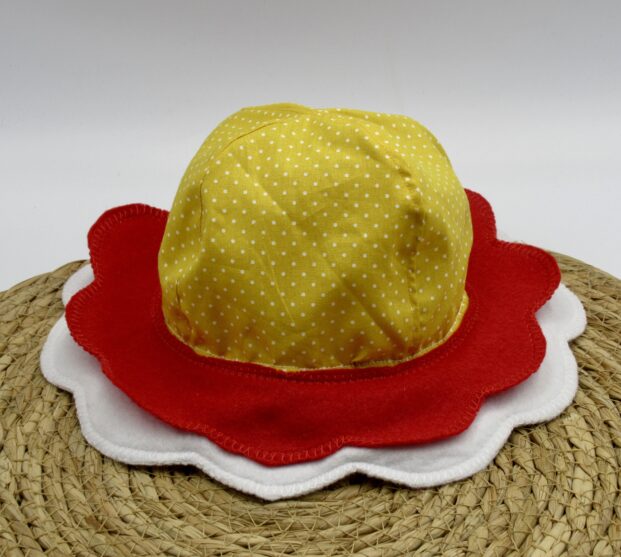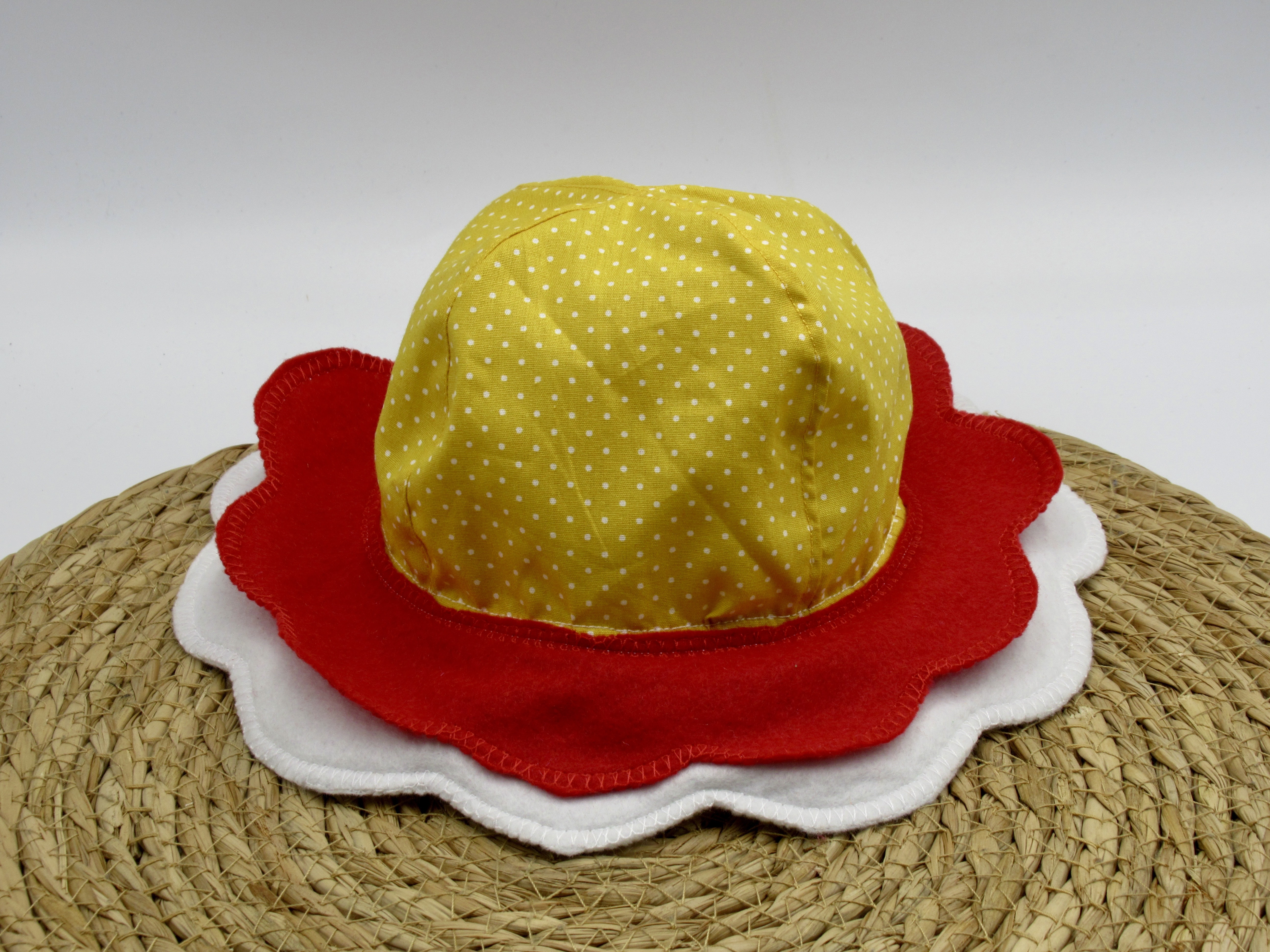De hoed in de vorm van een bloem heeft 2 bloemranden van vilt.  De bloemknop is gemaakt van katoen; in het geval van de foto is dat geel met een klein wit stipje. Kies je een andere kleur dan wordt het een uni kleur.