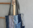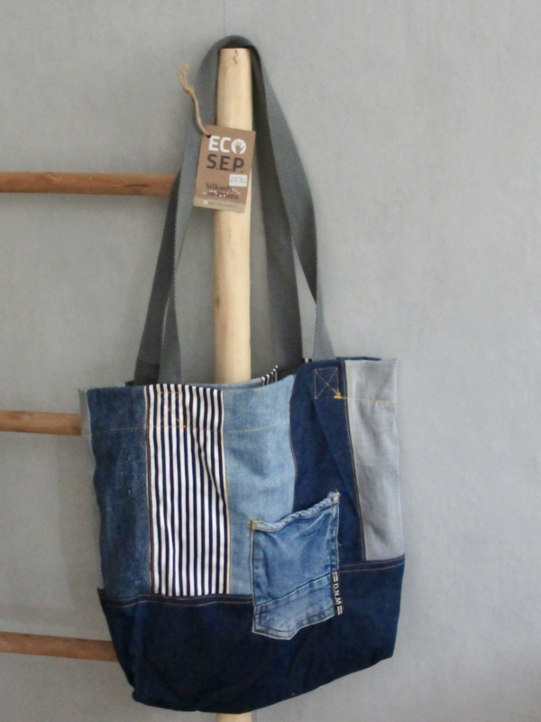 Deze leuke schoudertas ( ideaal voor boodschappen of een uitstapje) is gemaakt van stofjes uit oude spijkerbroeken en aangevuld met gestreepte 2de kans stof .