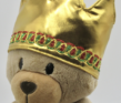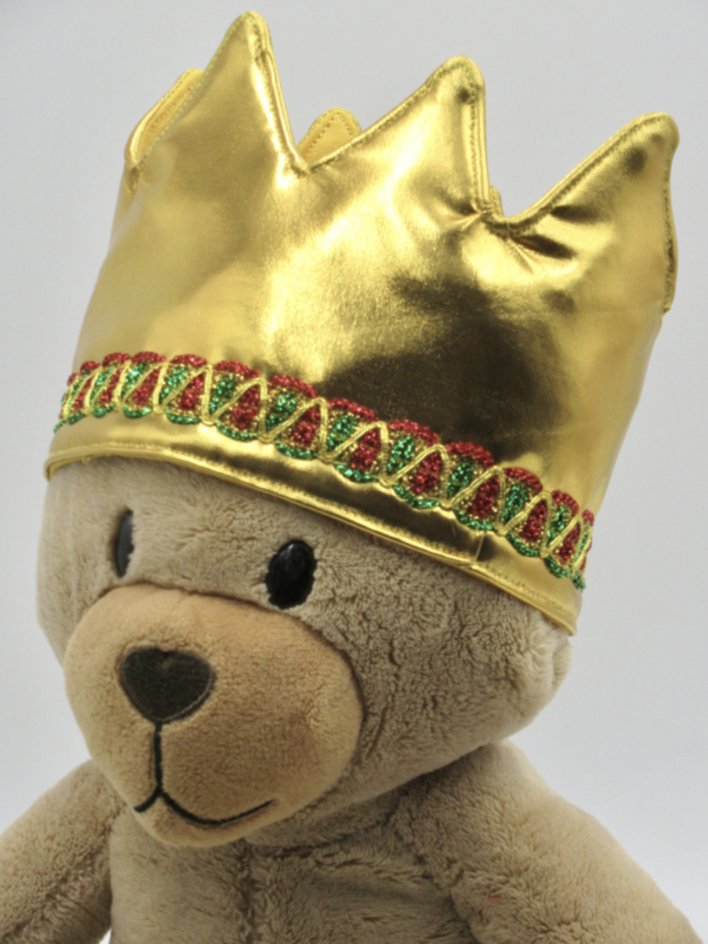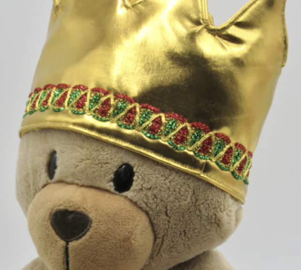 Mooie goudkleurige kroon, versiert met glitterband in rood en groen. de kroon is gemaakt van glanzende stof en verstevigd met dik vilt aan de binnenkant. Wasbaar dmv een handwasje.
