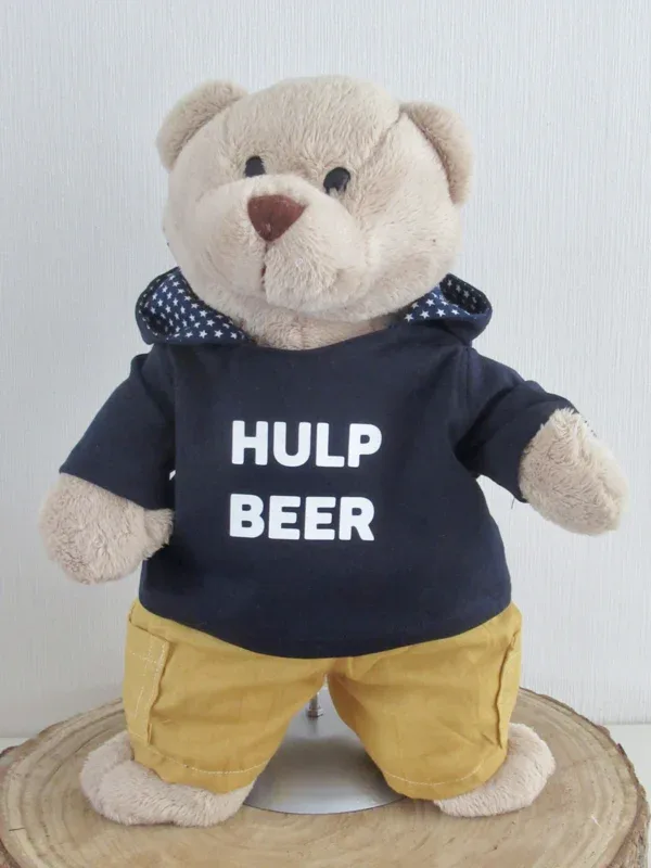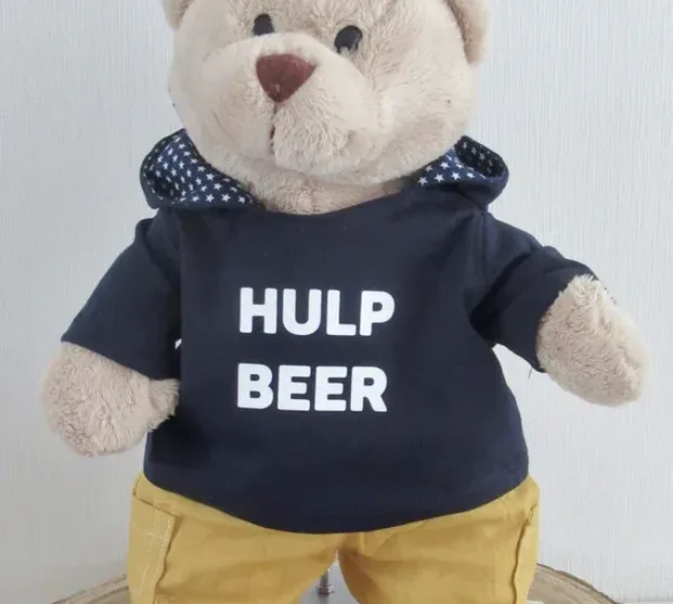 Kun jij een extra steuntje gebruiken van een vriend die altijd in de buurt is en die overal met je mee gaat?  Bestel dan deze beer van 32 cm.  ( in beige of bruin) met een hoodie en stoere broek in een kleur naar keuze. Afhankelijk van de gekozen kleur, wordt de opdruk HULP BEER in het wit of zwart op de hoodie gedrukt.