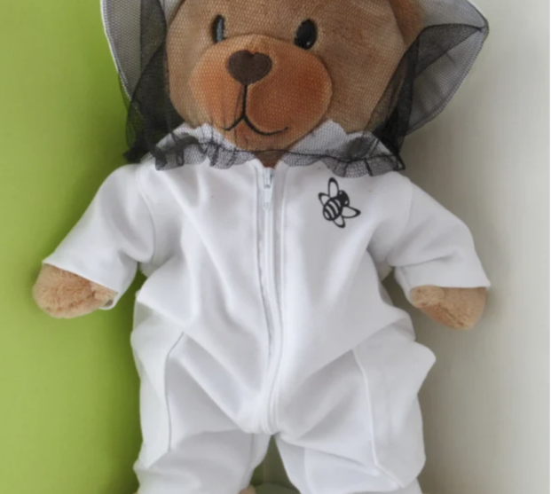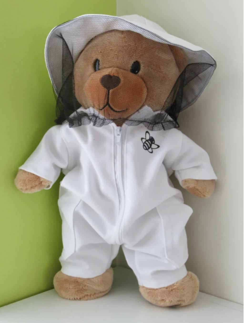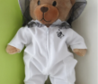 Deze kledingset bestaat uit een overall met 2 echte zakken. Hij sluit met een rits op de voorkant. De hoed heeft een gasrand rondom om het gezicht van beer Kiki te beschermen.
