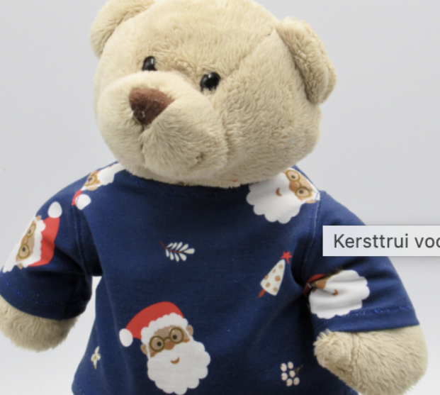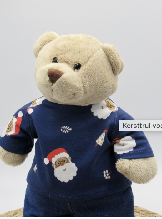 Beer Kiki wil natuurlijk ook een Foute Kersttrui!... we hebben een. mooie donkerblauwe trui met kerstman-gezichtjes en kleine kerstbomen. kersttakjes ed. De trui sluit met klittenband op de rug en is wasbaar op 40 graden.