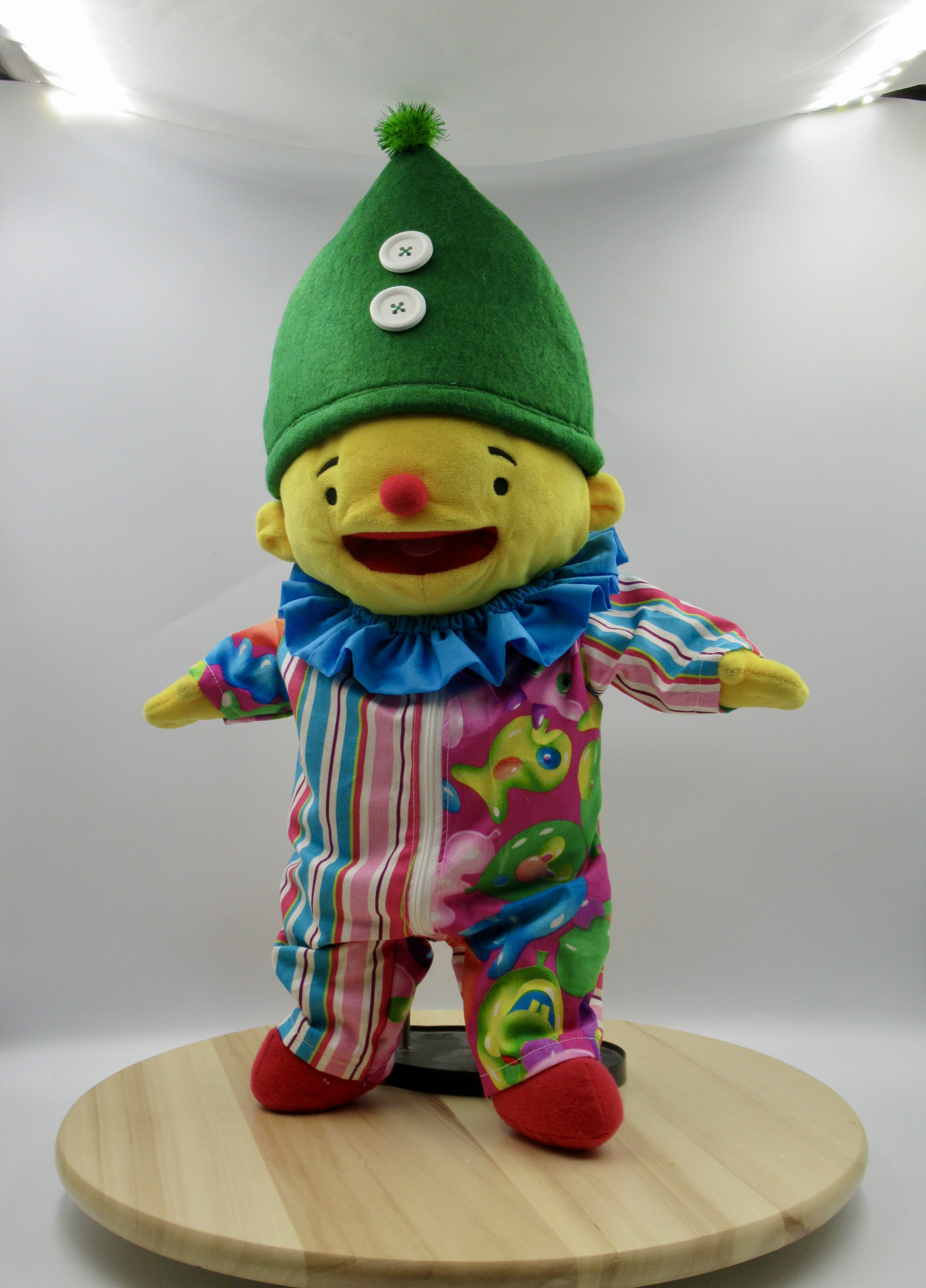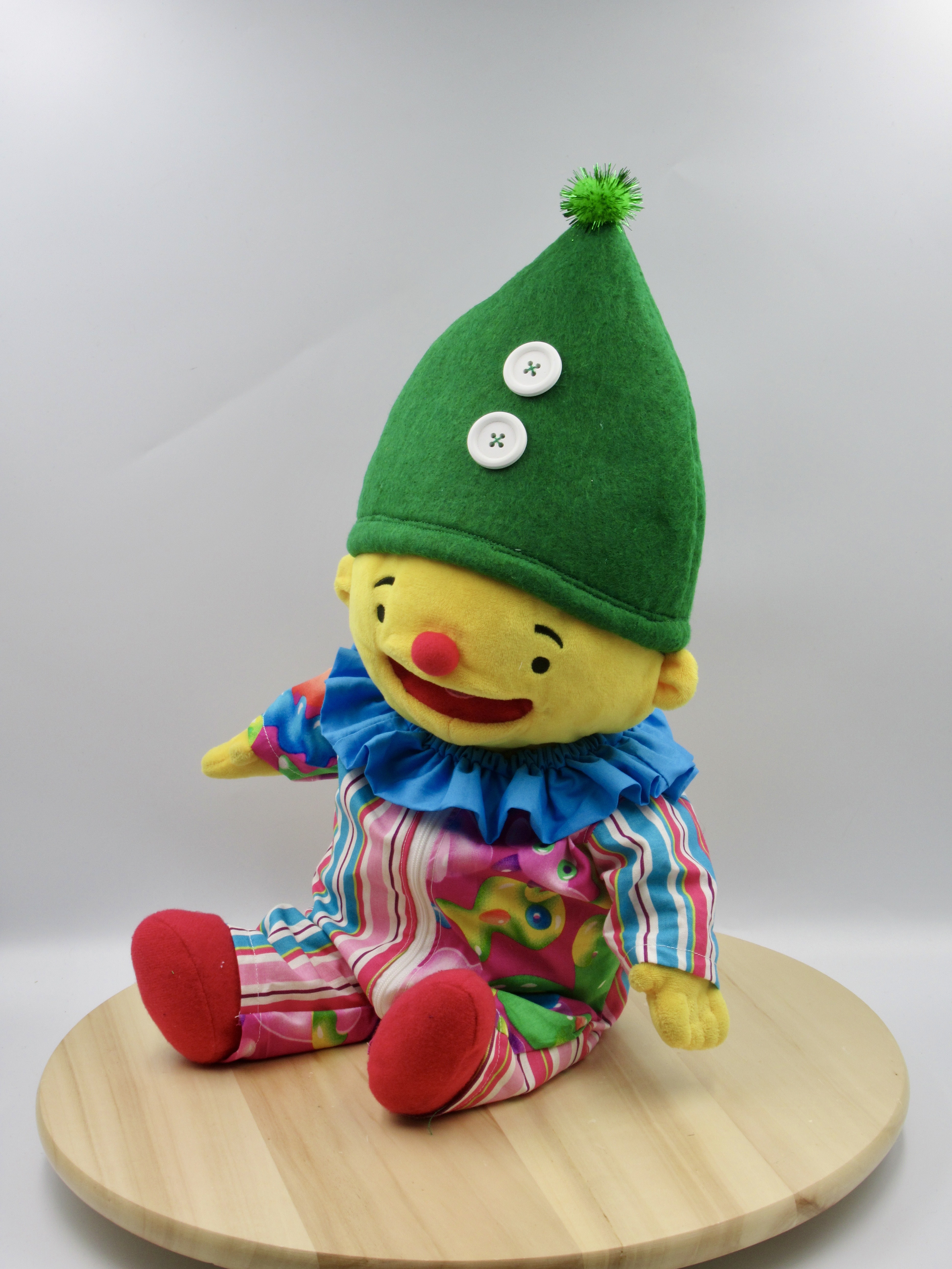 Met deze 3 delige set kun je Puk omtoveren naar een Clown. De overall heeft op de achterkant een opening zodat de handspeelfunctie gebruikt kan worden. De kraag heeft elastiek in de band en wordt over het hoofd geschoven. De puntmuts is van dik vilt gemaakt, waardoor hij goed rechtop blijft staat op het hoofd van Puk.