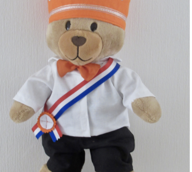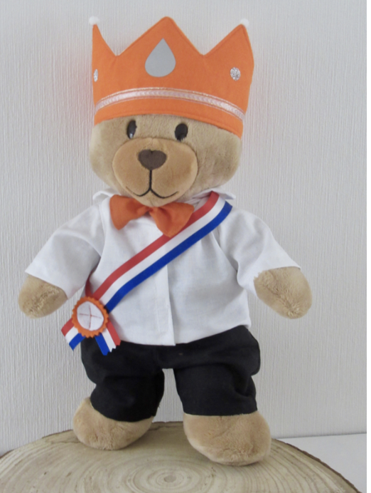 Leuke 5 delige set ( broek, overhemd, sjerp, strik en kroon) voor Koningsdag. Verkleed beer Kiki als koning of prins. De broek heeft elastiek in de band. Het oeverhemd sluit met klittenband op de voorkant. Beiden zijn wasbaar op 40 graden. De sjerp en de kroon kunnen gereinigd worden dmv een handwasje.