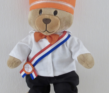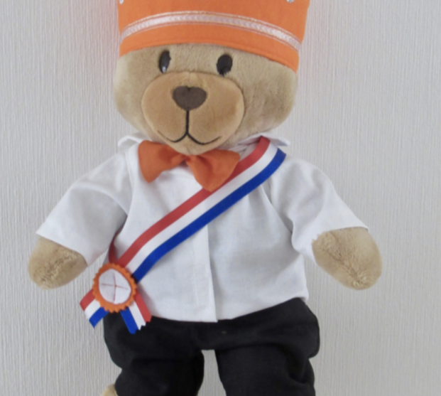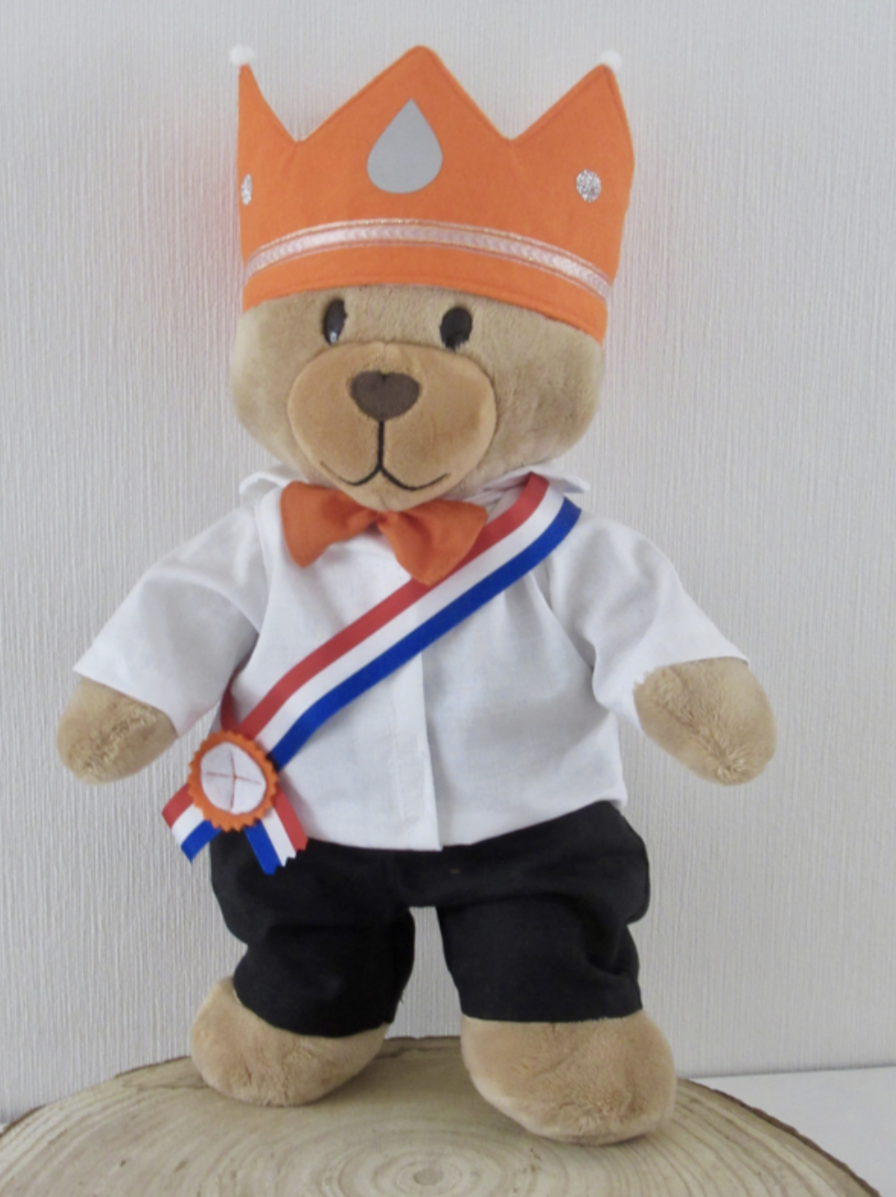 Leuke 5-delige set (broek, overhemd, sjerp, strik en kroon) voor Koningsdag. Verkleed beer Kiki zich als koning of prins? Broek, blouse en strik zijn wasbaar op 40 graden. De sjerp en kroon kun je wassen met een handwasje.