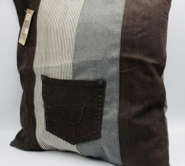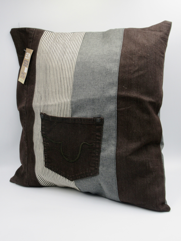 Deze stoere kussenhoes is gemaakt van hergebruikt spijkergoed in zwart en grijs. De hoes heeft een rits waardoor hij makkelijke te wassen is. Hij heeft een gemeleerde grijze achterkant.  Een kontzak van een spijkerbroek maakt hem af. wasbaar op 40 graden.