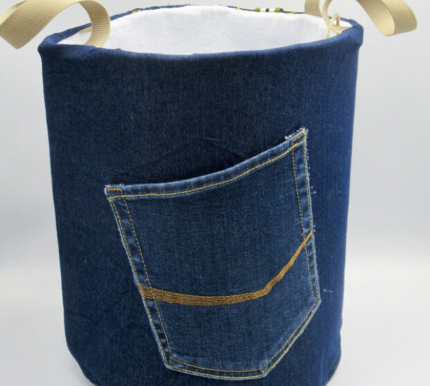 Deze leuke hoge mand met 2 handvatten heeft een doorsnede van 26 cm en een hoogte van 31 cm.  De buitenkant is van 2de kans spijkergoed en heeft een grote kontzak van een spijkerbroek. De binnenkant is gevoerd met vilt.