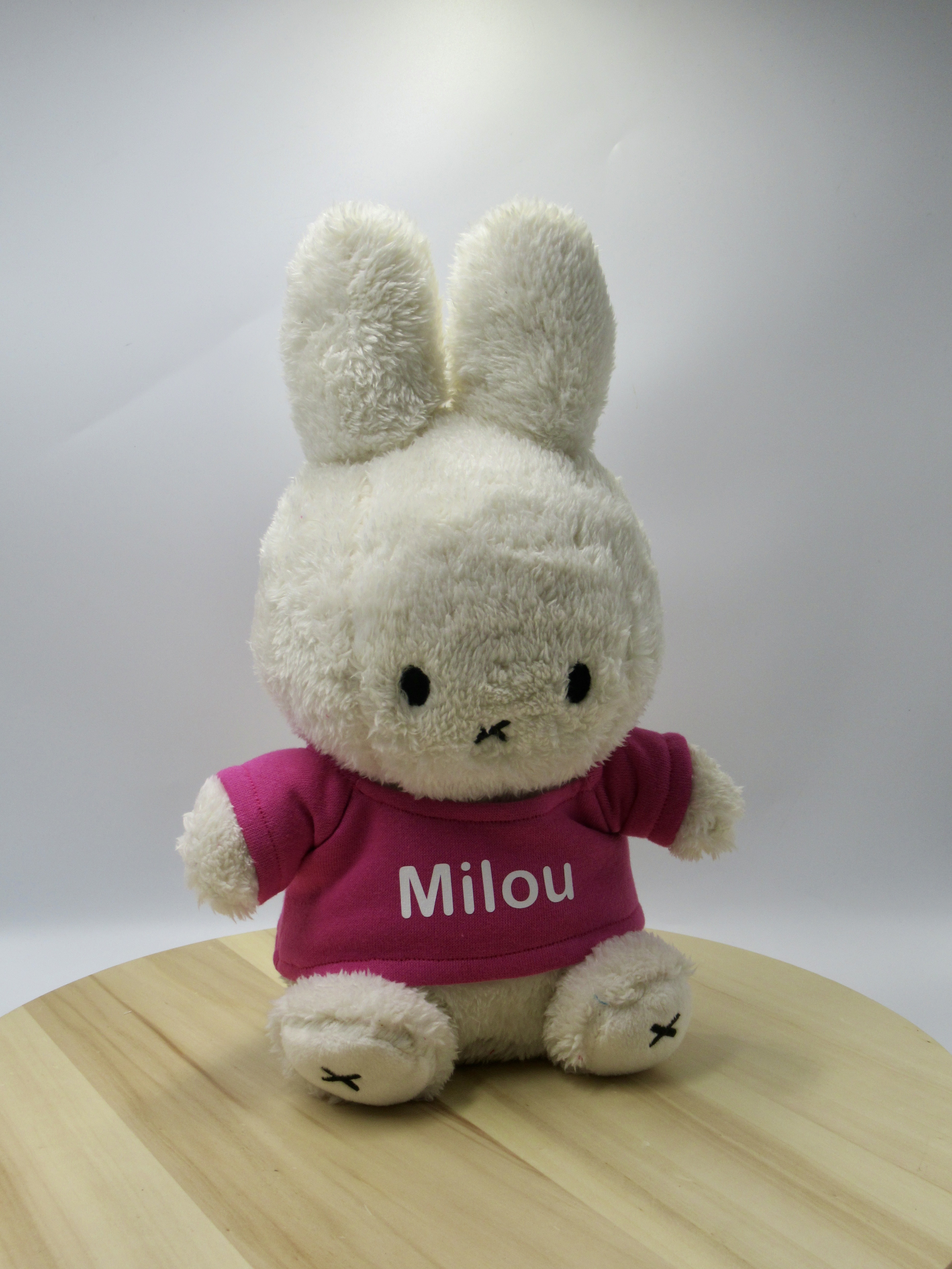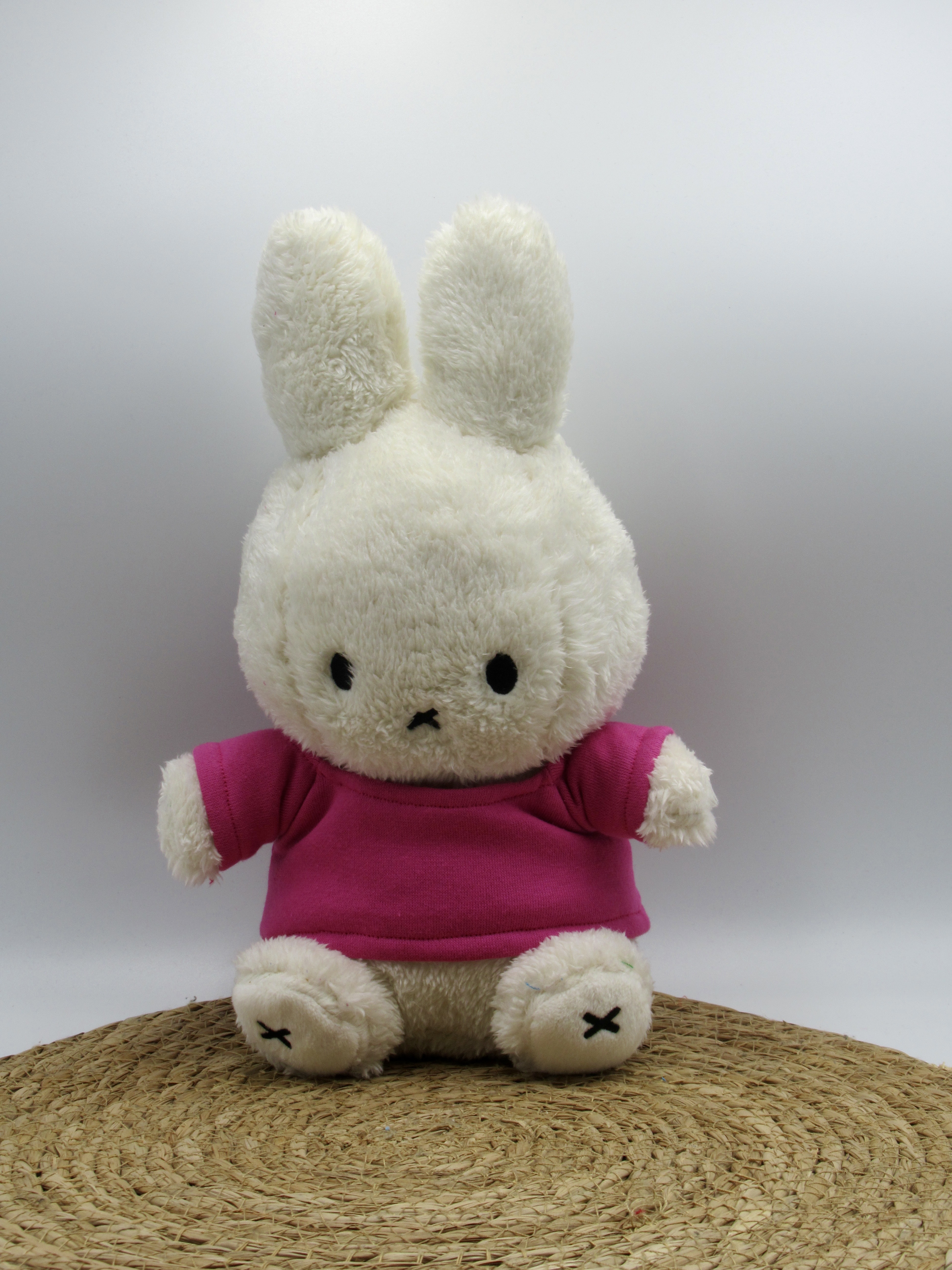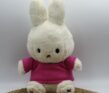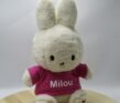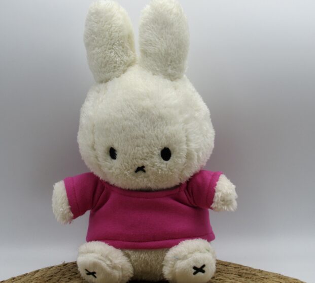 Deze zachte knuffel is 30cm hoog en in wit of lichtblauw te bestellen. Gemaakt van zachte teddystof. In Lila is de knuffel gemaakt van een gladde 100 procent polyester stof. Het shirtje sluit op de rug met een klittenbandsluiting waardoor het shirtje eenvoudig aan- en uit te trekken is. De knuffel + bedrukt shirtje is wasbaar. Drogen aan de lucht ivm behoud van de vorm van Nijntje.