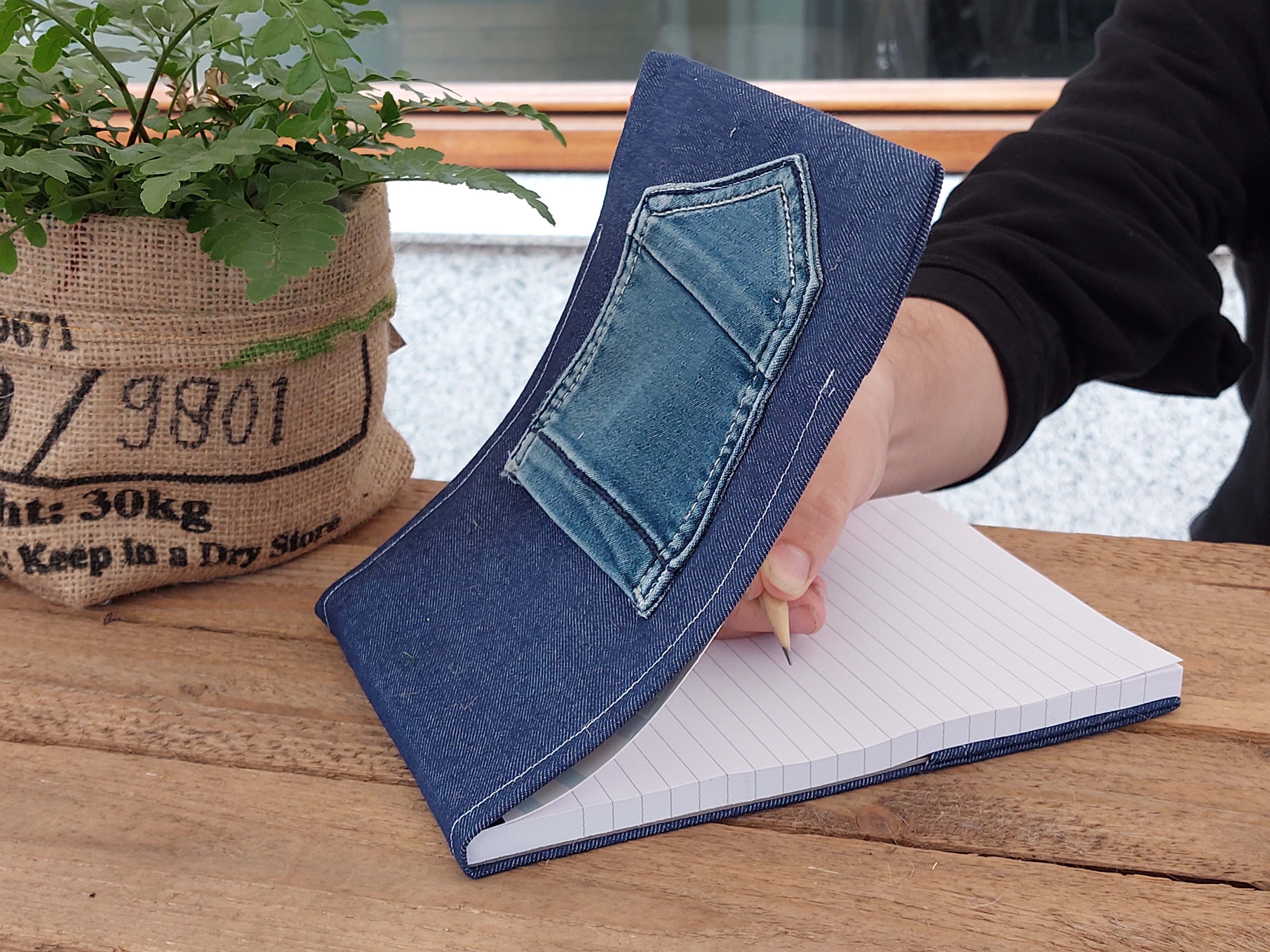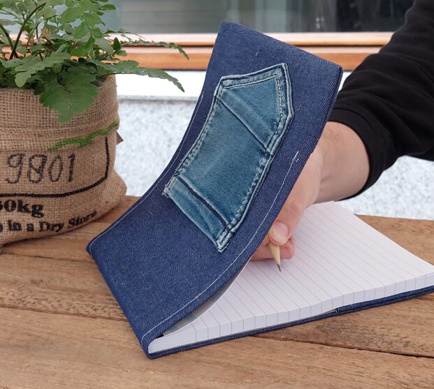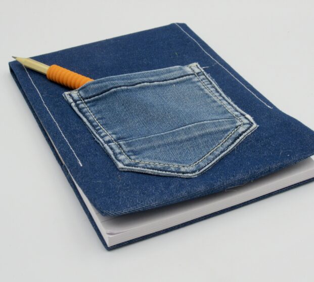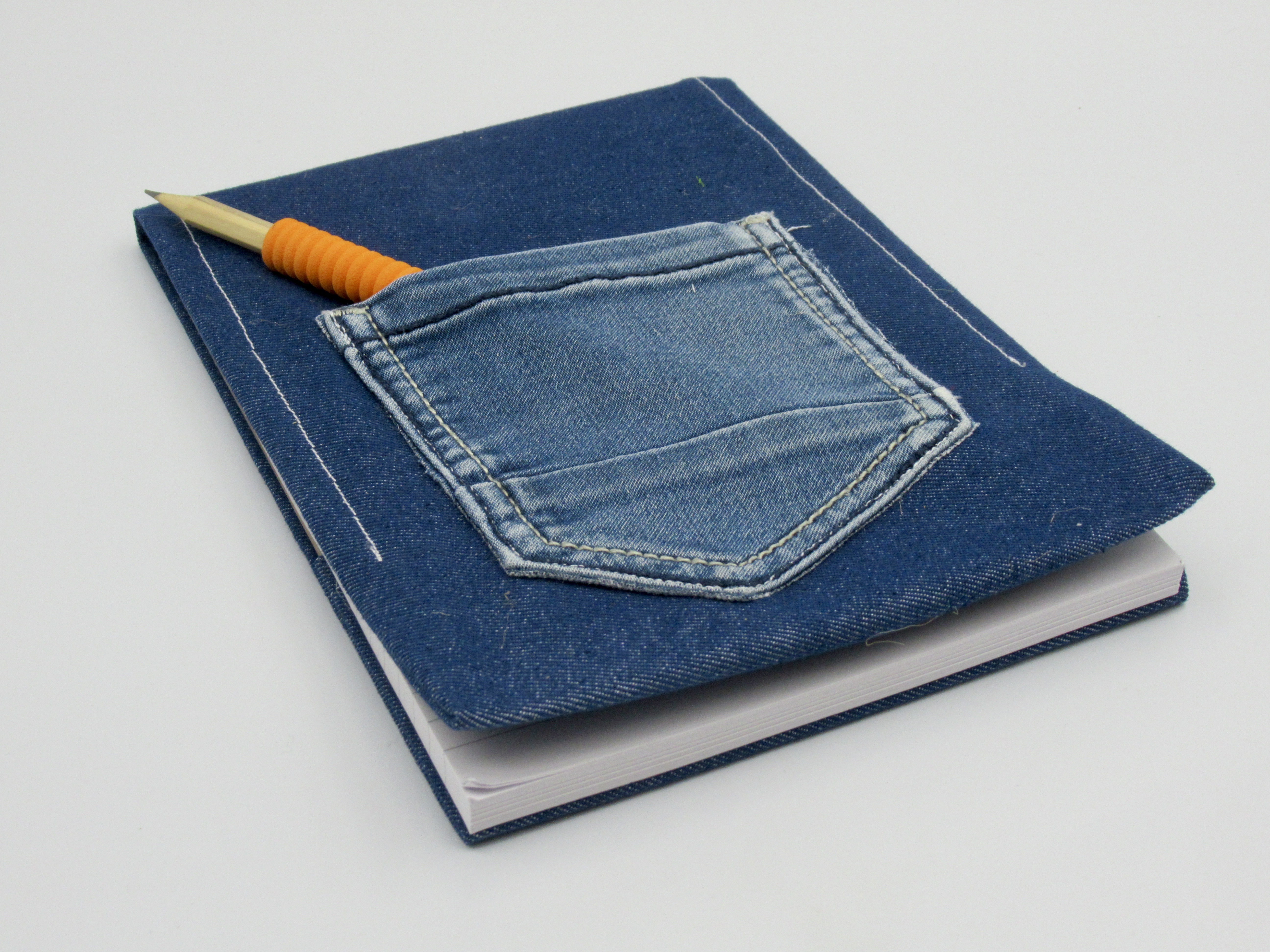 In het (kont)zakje ( hergebruikt van een kinderspijkerbroek) kun je belangrijke boodschappen / bonnetjes/ een potlood of iets anders handig bewaren. Het potlood ( in een willekeurige kleur) krijg je er gratis bij. Is het blok op... steek heel eenvoudig een nieuw blok in de hoes ... zo kun je heel lang plezier hebben van dit leuke blok.