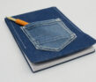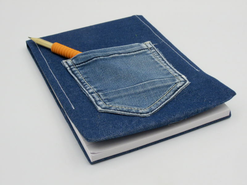 In het (kont)zakje ( hergebruikt van een kinderspijkerbroek) kun je belangrijke boodschappen / bonnetjes/ een potlood of iets anders handig bewaren. Het potlood ( in een willekeurige kleur) krijg je er gratis bij. Is het blok op... steek heel eenvoudig een nieuw blok in de hoes ... zo kun je heel lan plezierhebben van dit leuke blok.