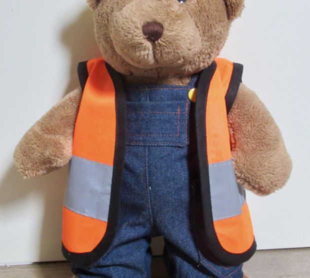 Wegwerkzaamheden! Heb je Kiki al aan het werk gezien in zijn salopette van spijkerstof? Voor de veiligheid draagt hij een refecterend hesje en helm.