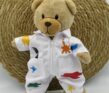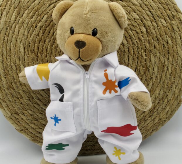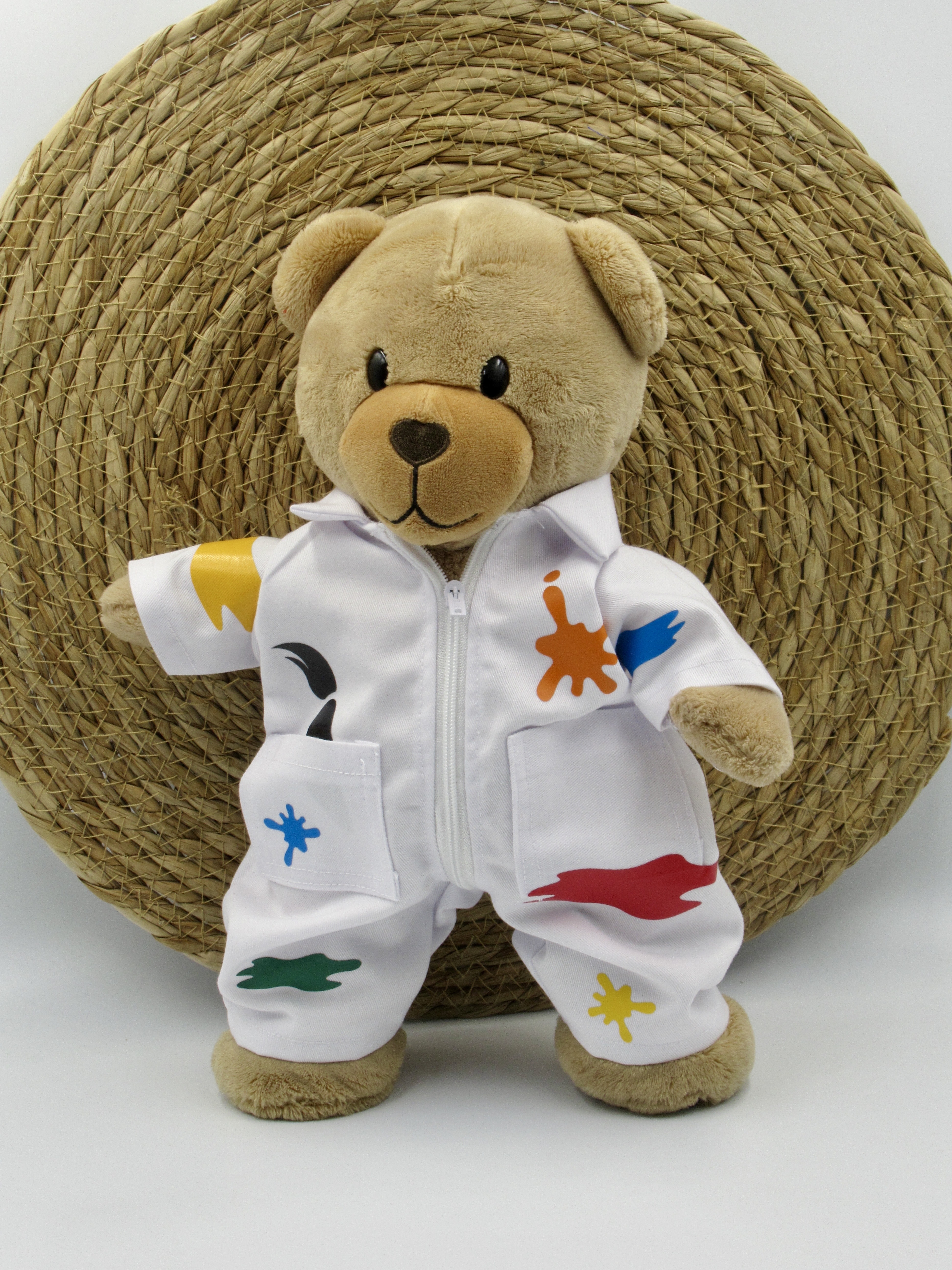Een overall (met 2 zakken en een ritssluiting op de voorkant) is bedrukt met een kwast en verfvlekken. in vrolijke kleuren. De overall is wasbaar op 40 graden.