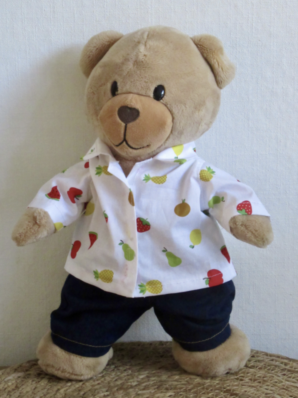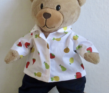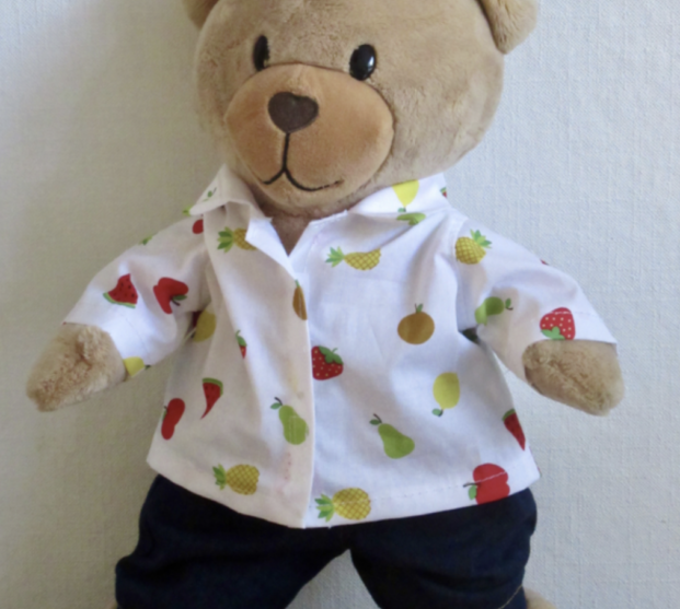 Een overhemd voor beer Kiki met daarop diverse soorten fruit als print op de stof. Een appel, peer, citroen, meloen, kersen. Leuk om bij de thema's fruit, gezonde voeding, de tuin, boodschappen doen, ed. te gebruiken. Het bloesje sluit met klittenband op de voorkan en is wasbaar op 40 graden.