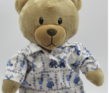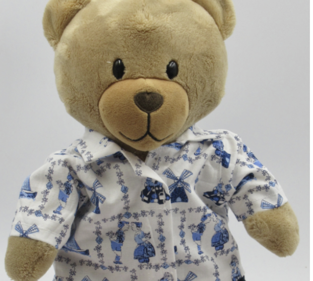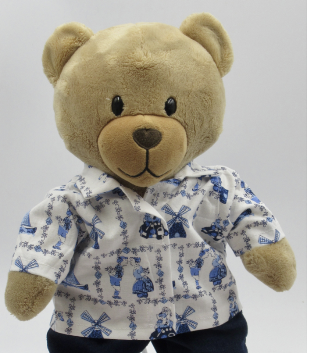 Blouse voor knuffel Kiki; in het wit met afbeeldingen van een koe, molen, klompen, een zeilboot en mensen in klederdracht, afgebeeld in delfsblauwe kleuren. Het bloesje sluit met klittenband aan de voorkant en is wasbaar op 40 graden. Excl. beer