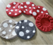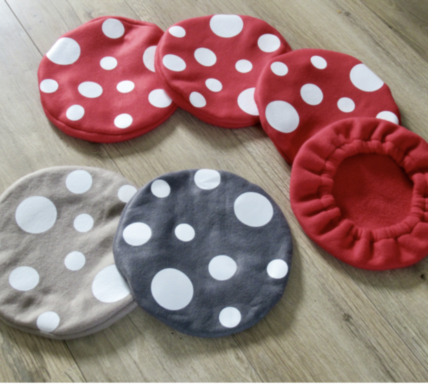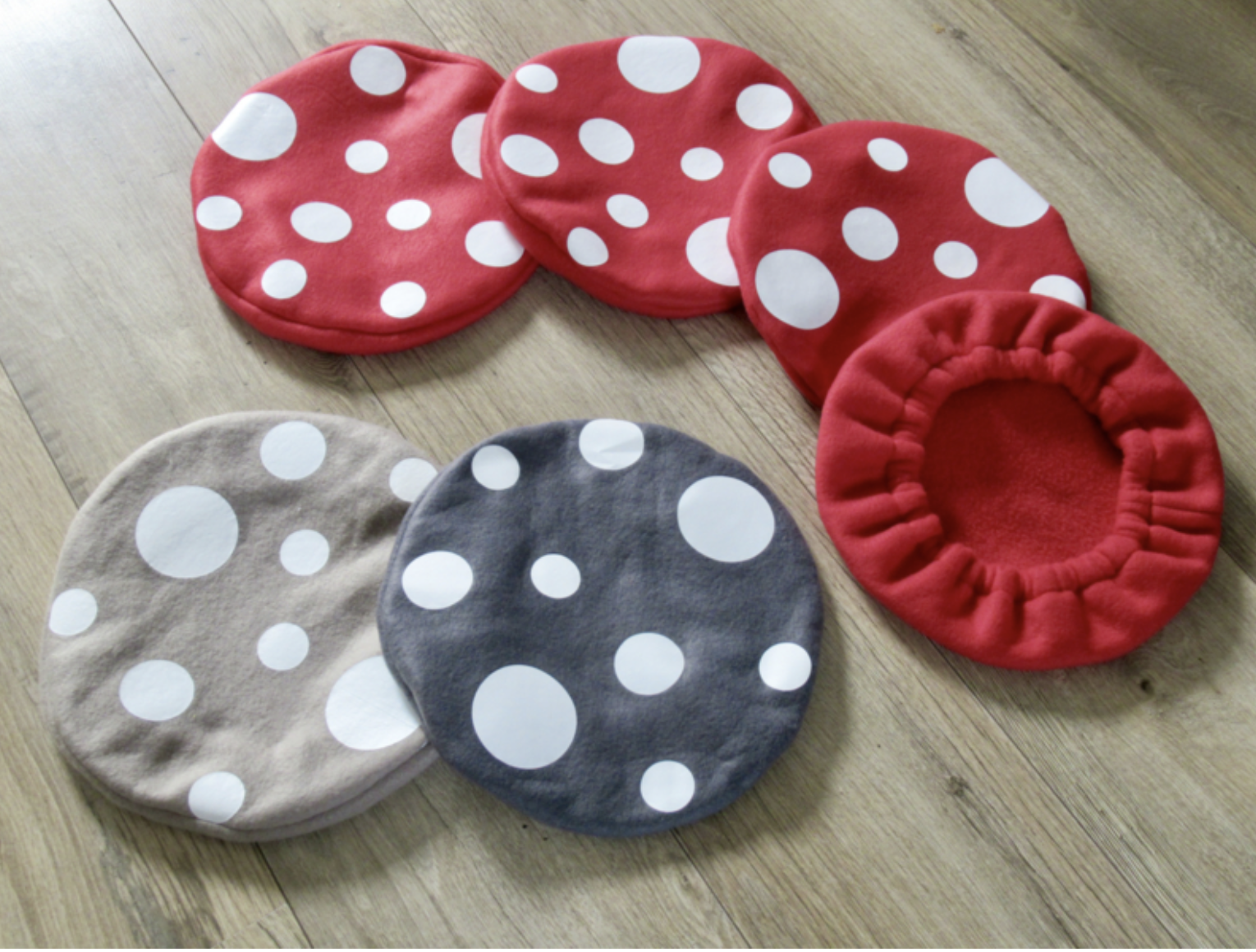 Wij maken daar hoesjes voor in rood, zandkleur of grijs. De hoesje worden gemaakt van fleecestof en sluiten met een elastiek onder de zitting van het krukje. De stippen worden door ons op de stof gedrukt. De hoes is goed wasbaar en heel eenvoudig weer van de kruk te halen. Erg leuk als decoratieartikel, maar ook als krukje voor de kabouters van de opvang.
