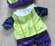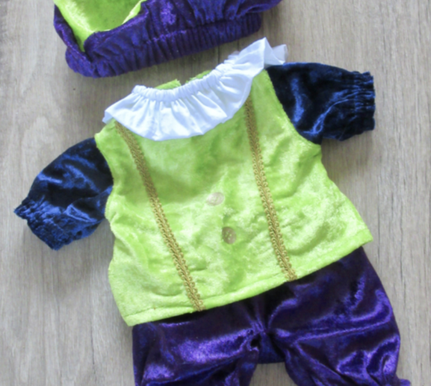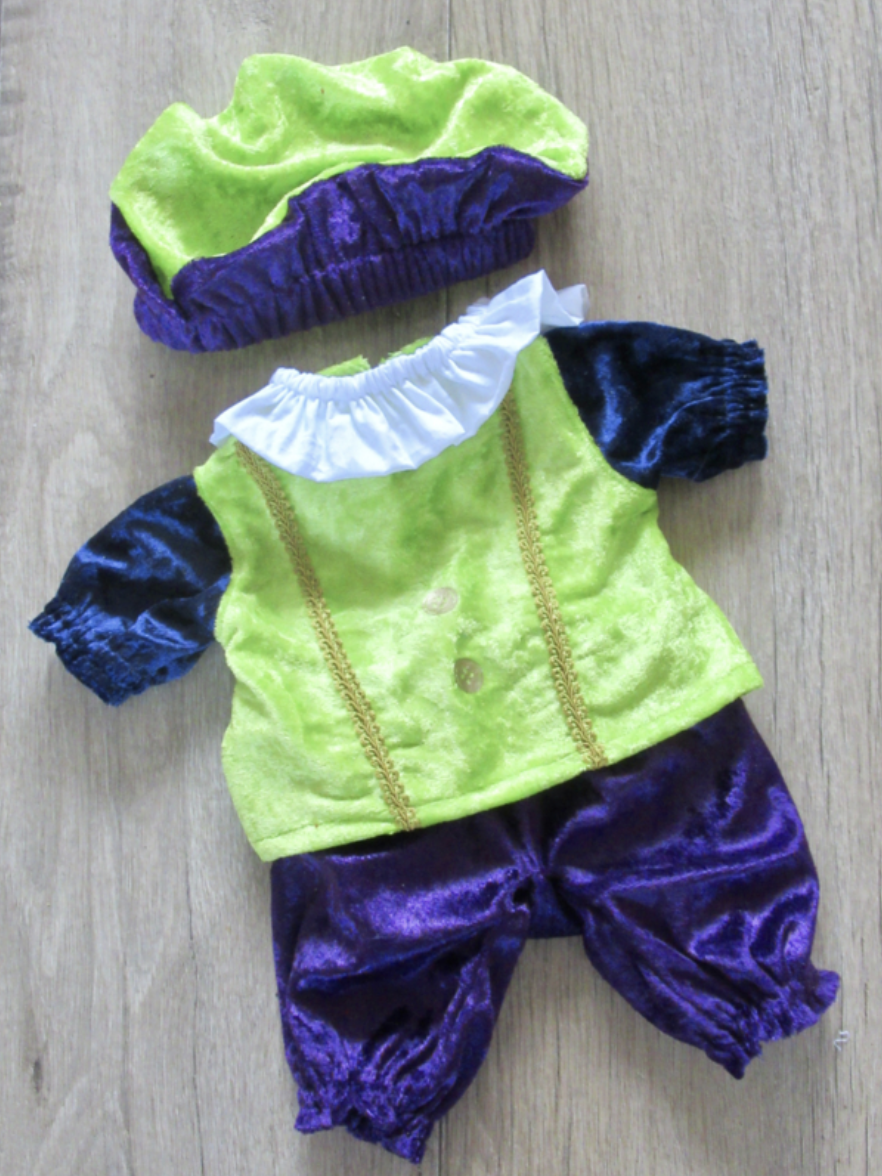 Een 4 delig pietenpak, geschikt voor de handpop van 42 cm. hoog. Kies 3 kleuren en wij maken een mooi pak van velour de panne stof, afgewerkt met goud en/of zilverkleurig band en nepknopen ( een afbeelding die op de stof gedrukt is).