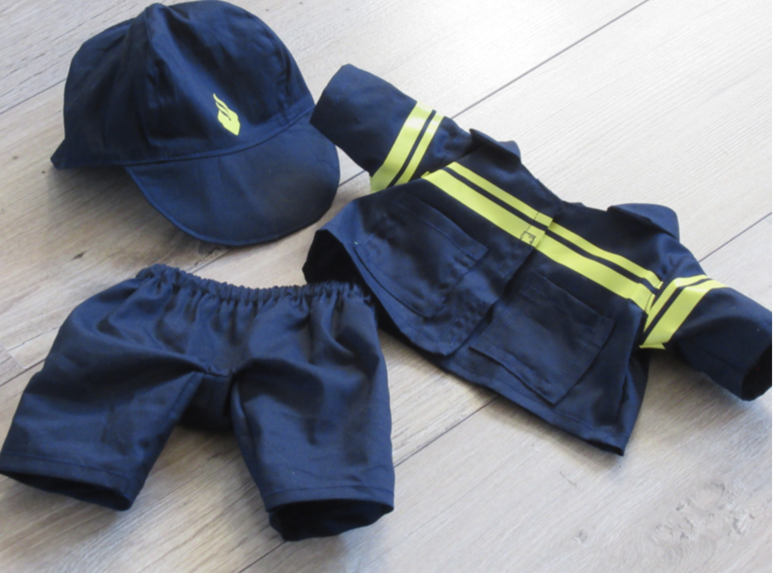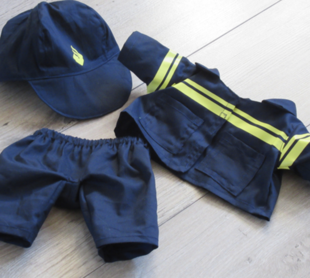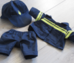 3 delige set: een blauwe broek met elastiek in de band, een jasje (met opgedrukte gele strepen) wat sluit met klittenband op de voorkant en een pet met opgedrukt embleem. Alles is wasbaar op 40 graden.