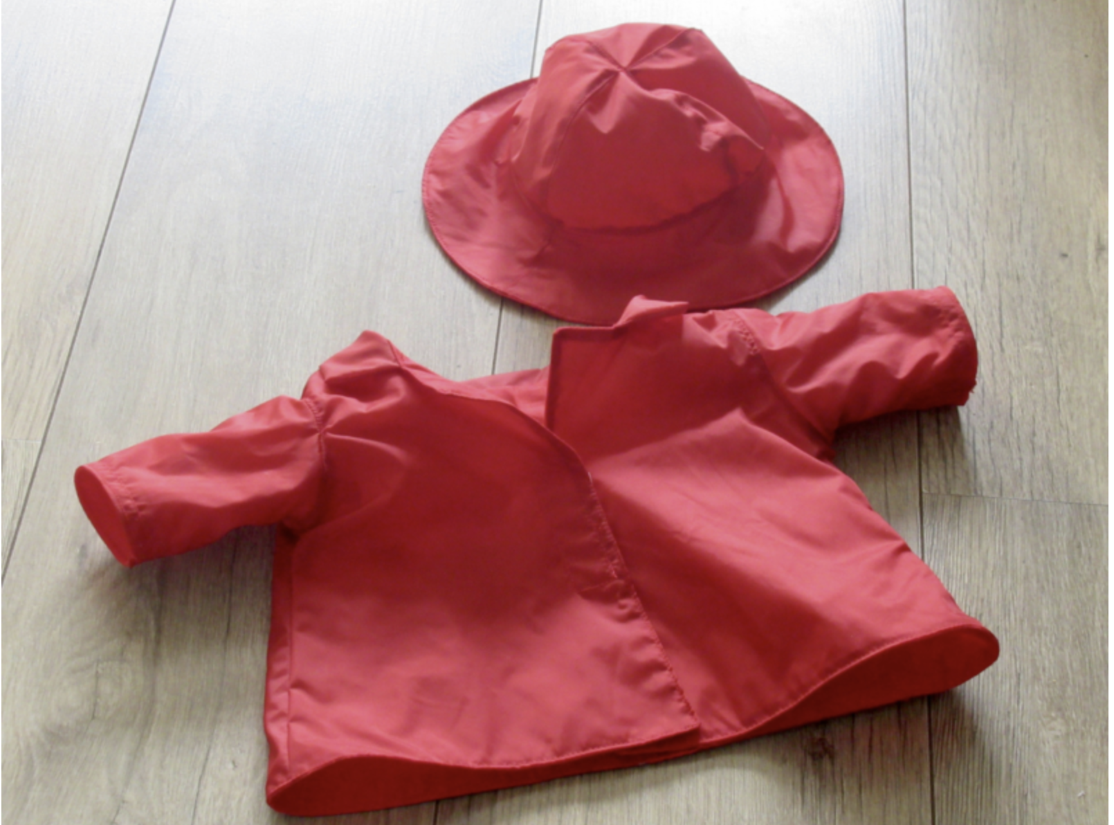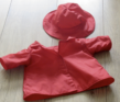 De jas + hoed zijn gemaakt van water afstotende stof. beiden zijn gevoerd met een stofje van katoen. De set is wasbaar op 40 graden. De jas sluit met klittenband