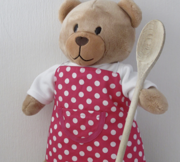 Het schort is gemaakt van vrolijk katoen. het sluit met koordjes op de ruk. In de nek met elastiek. het is wasbaar op 40 graden.