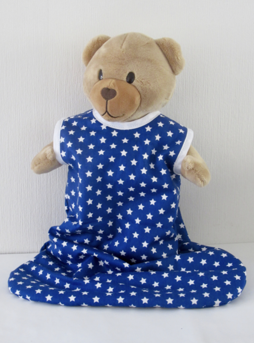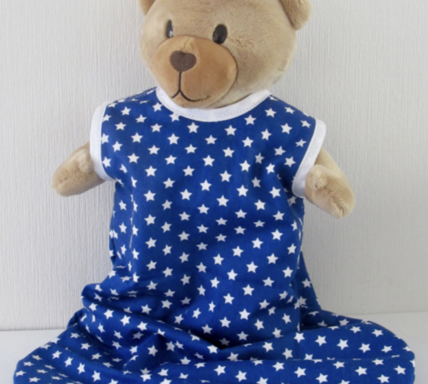 Deze slaapzak met klittenband sluittingen op de schouders is gemaakt van katoen en gevoerd met flanel of molton. Wasbaar op 40 graden. In diverse kleuren te bestellen.