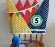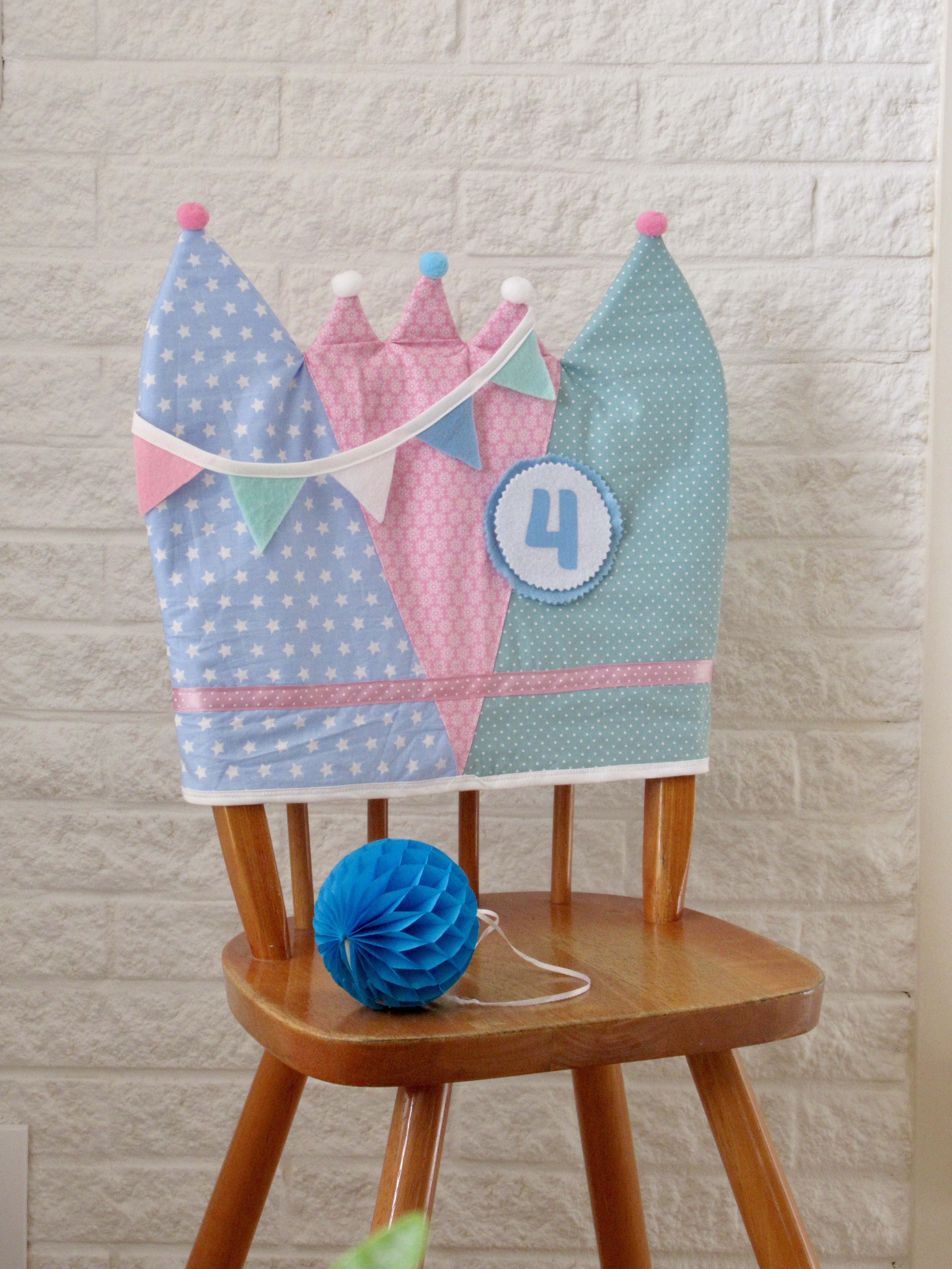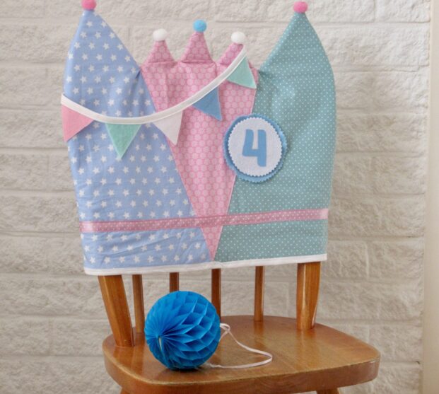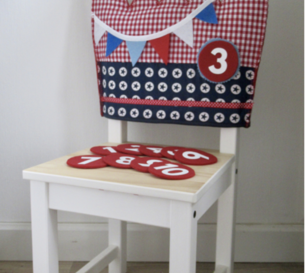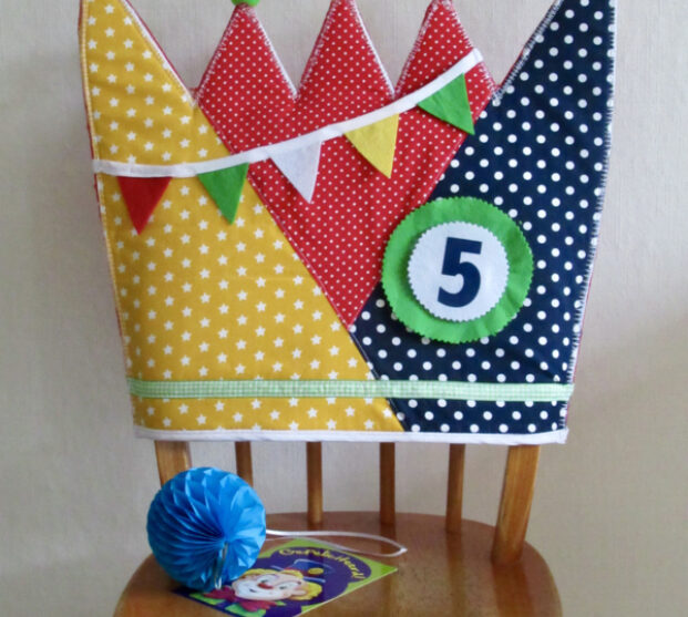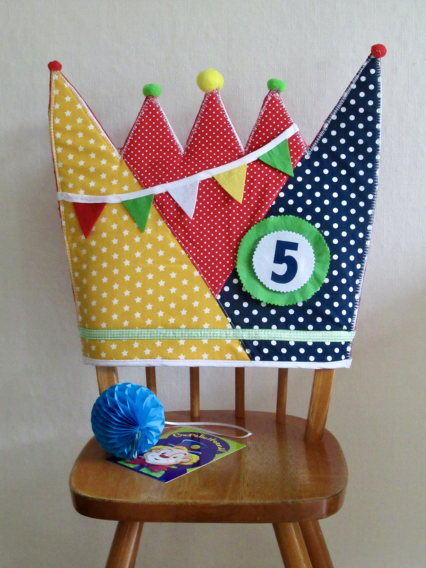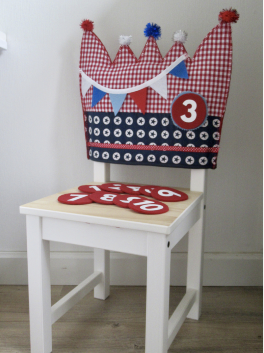 Een kroon voor op de rugleuning van de stoel van de jarige. De kroon (handgemaakt van stof en vilt) past bijvoorbeeld op een kinderstoel van IKEA en wordt standaard geleverd met de verwisselbare cijfers 1 t/m 10. Extra/andere verwisselbare cijfers zijn bij te bestellen voor €0,25 per stuk.