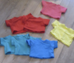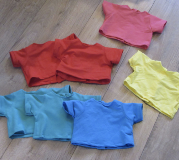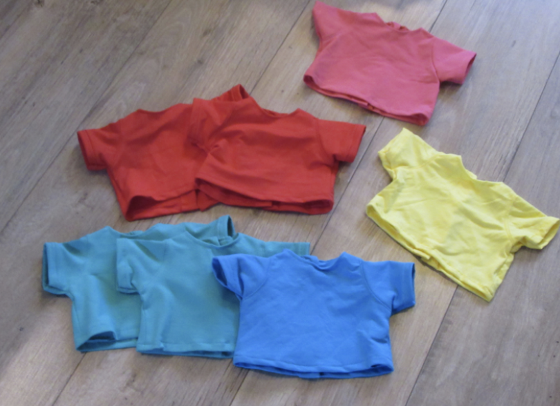 Wij maken de t-shirts van tricot stof, in uni kleurtjes met een klittenbandsluiting op de rug. Wasbaar op 40 graden.