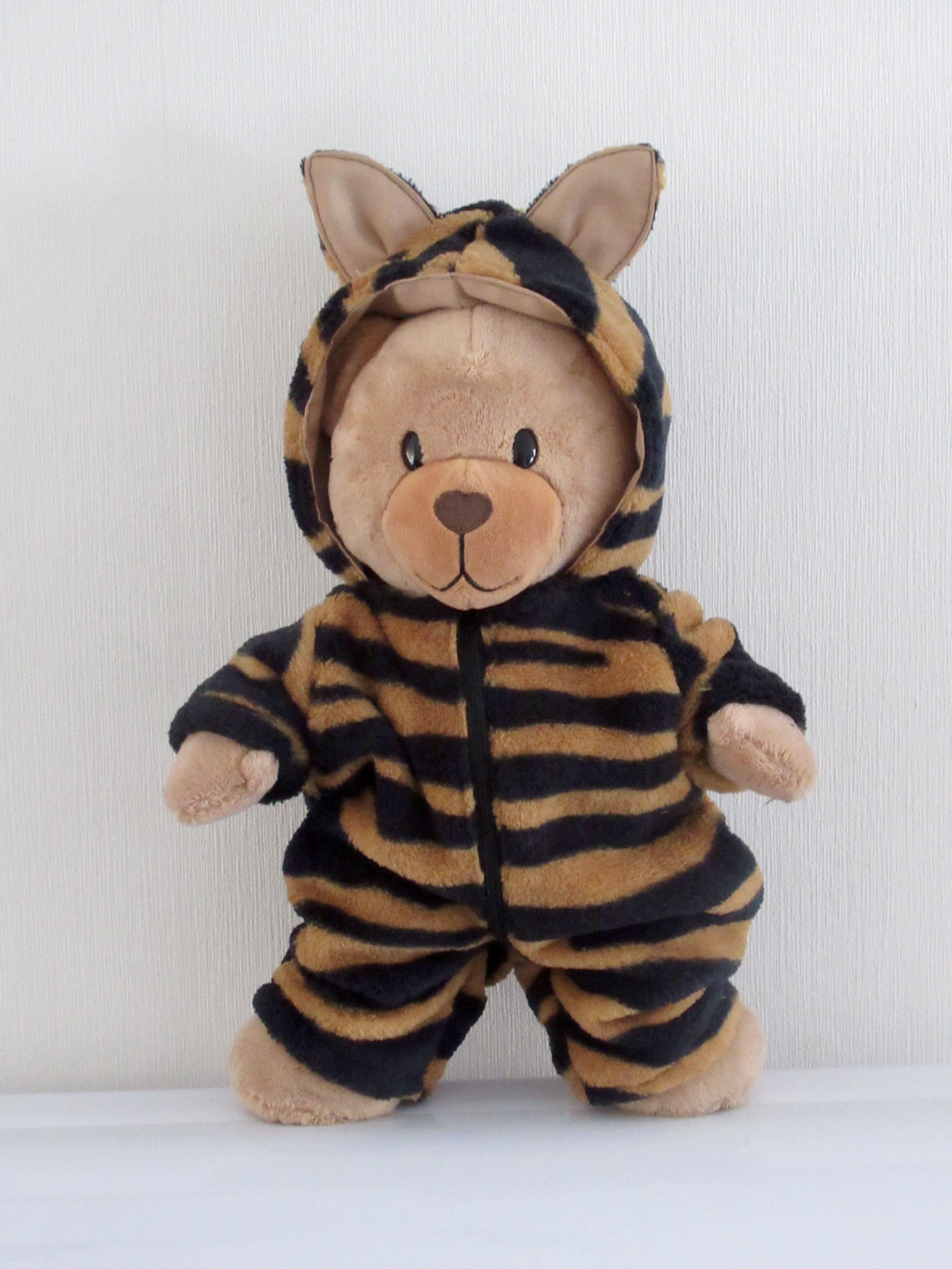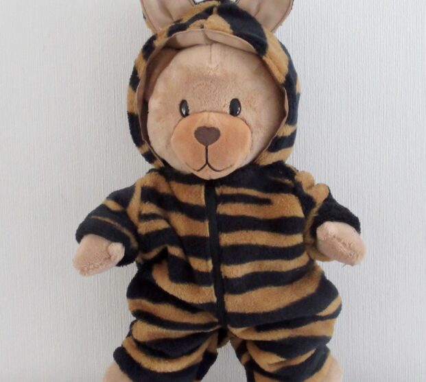 Dit tijgerpak voor beer Kiki met een ritssluiting op de voorkant, heeft een staart op de achterkant. Het is gemaakt van zachte fleecestof en is wasbaar op 40 graden. Excl beer.