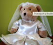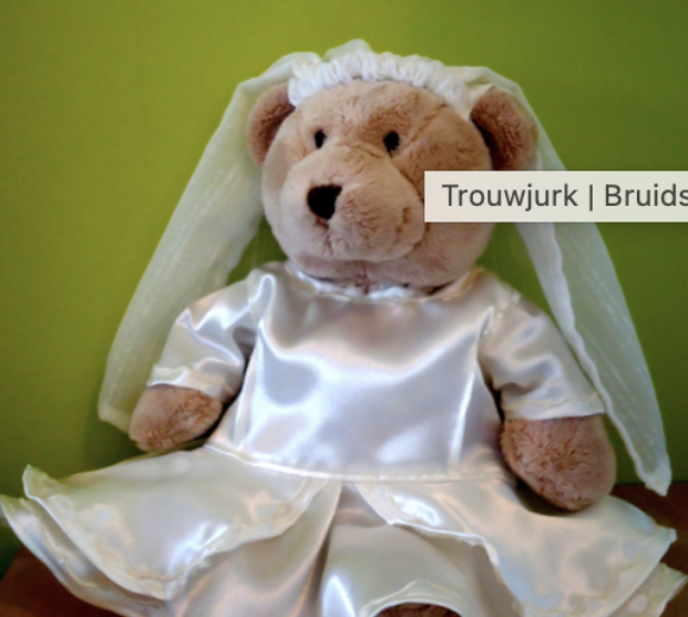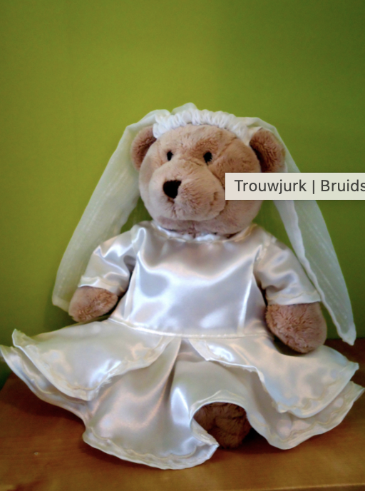 Deze mooie bruidsjurk met sleep voor beer Kiki is gemaakt van glanzende stof gecombineerd met vitrage stof. Wasbaar op 30 graden. De jurk sluit met klittenband op de rug. De sleep wordt dmv elastiek op het hoofd gezet.