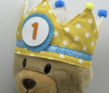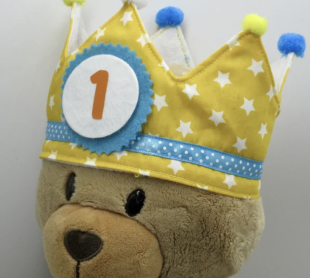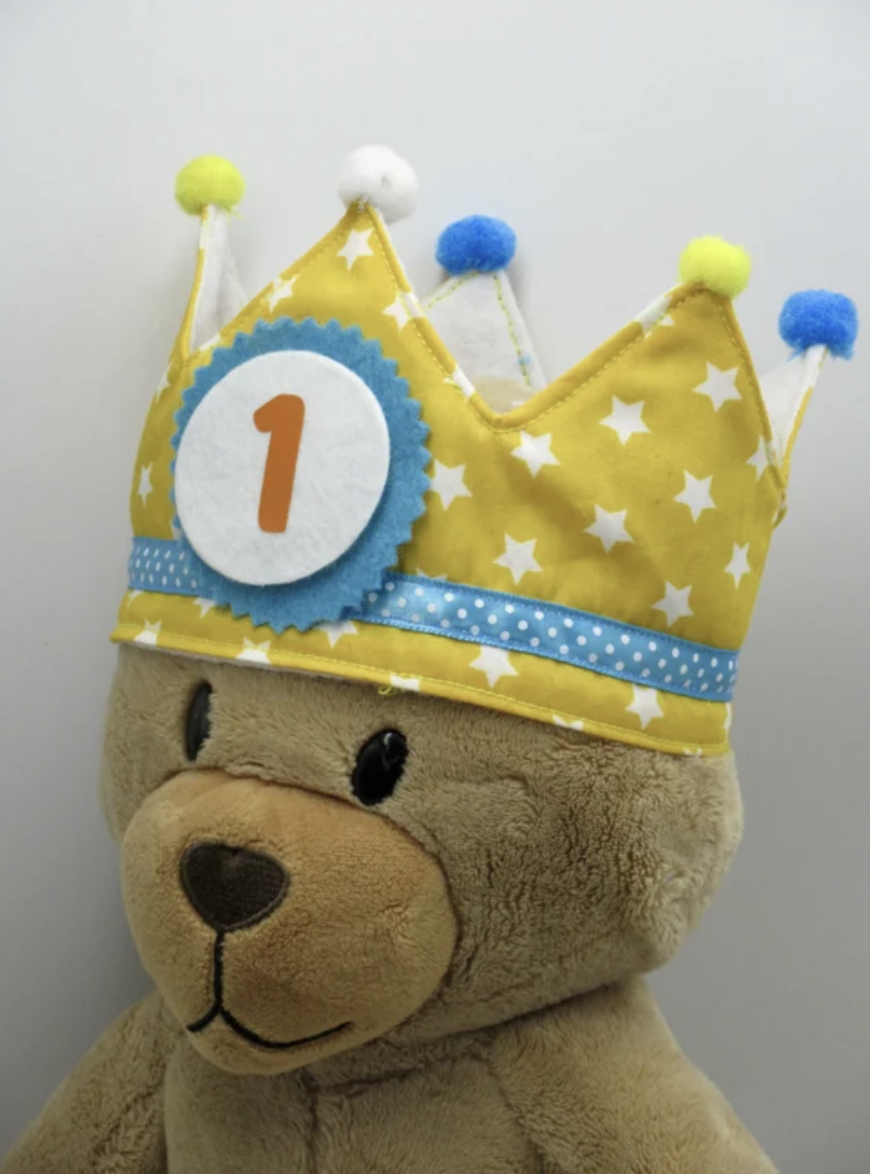 De kroon is gemaakt van een vrolijk katoenen stofje en gevoerd met vilt. Bij de kroon worden 5 verwisselbare labels ( dmv klittenband) geleverd met de cijfers 1 t/m 5. De labels zijn gemaakt van vilt. het cijfer wordt hierop gedrukt.