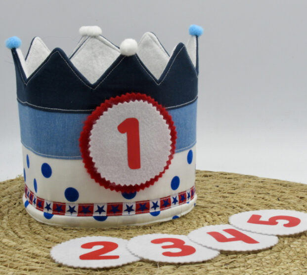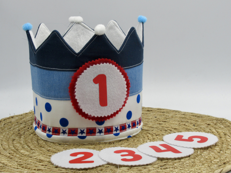 Verstelbare verjaardagsmuts (dmv klittenband) in blauw /rood met verwisselbare cijfers 1 t/m 5. De muts is gemaakt van 2de kans stof, aangevuld met vilt en pompons.