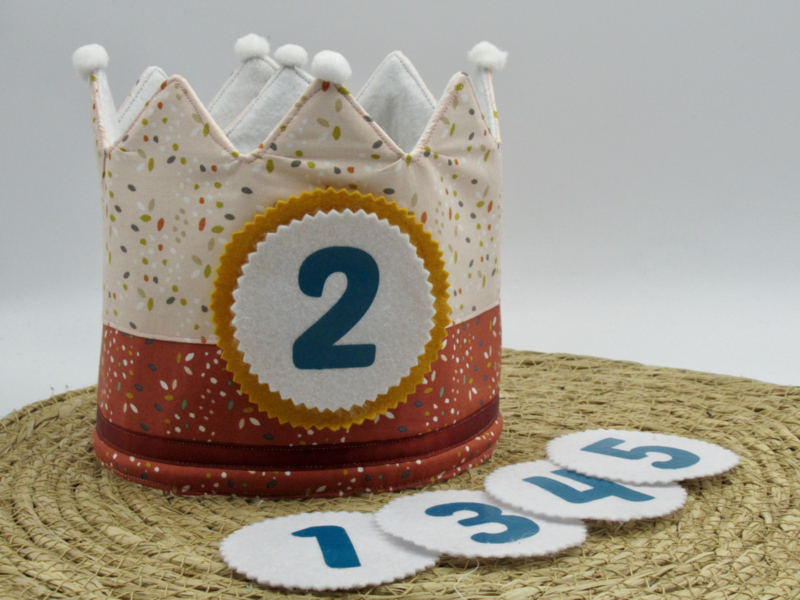 Verstelbare verjaardagsmuts (dmv. klittenband) in de kleuren zand/oranje-rood met verwisselbare cijfers 1 t/m 5. De muts is gemaakt van ecologische stoffen,  aangevuld met vilt en pompons.