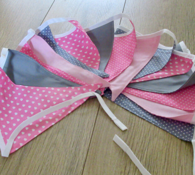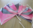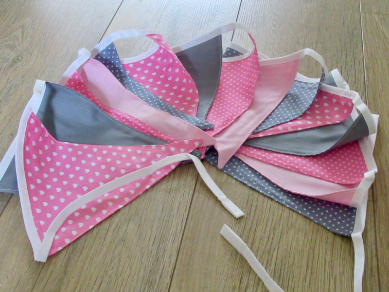 Voor een babymeisje, of gewoon omdat het leuke kleuren zijn, hebben we deze vlaggetjesslingeer met 15 vlaggen op voorraad. De  vlaggetjes zijn 19 cm breed en 21,5 cm. hoog. Ze zijn gemaakt van dubbele stof en hangen aan een lijn van biaisband. de tussenruimte tussen de vlaggen is 6 cm. De totale lengte van de slinger is ongeveer 4 meter.