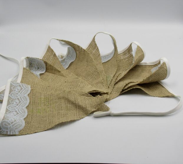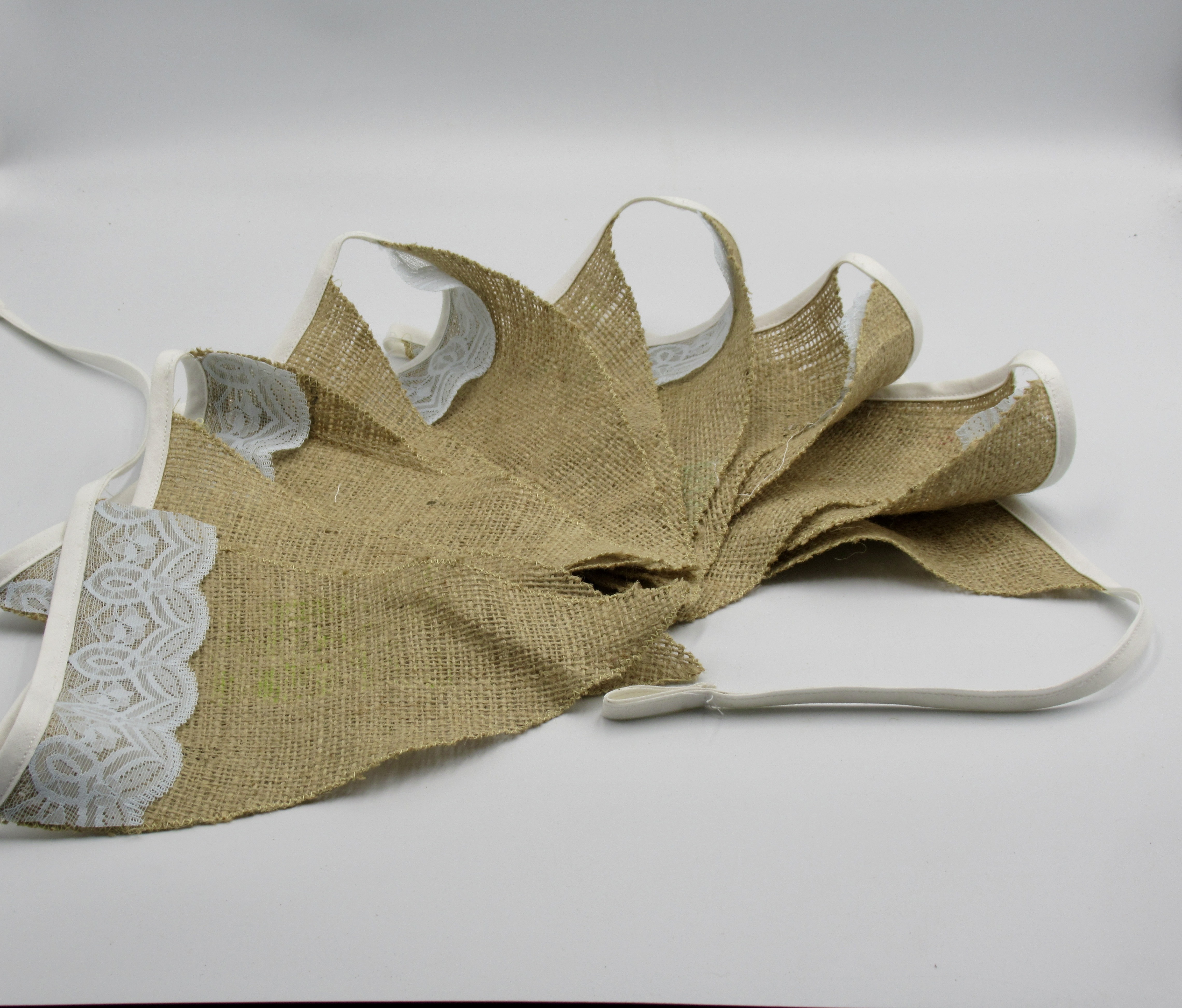 Deze vlaggenlijn is ongeveer 3.20 meter lang en heeft 12 vlaggen van 19 cm breed en 21,5 cm lang. De vlaggen zijn gemaakt van jute. De helft van de vlaggen heeft een kanten rand aan de bovenzijde van de vlag.