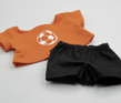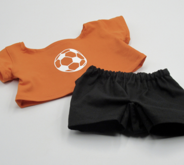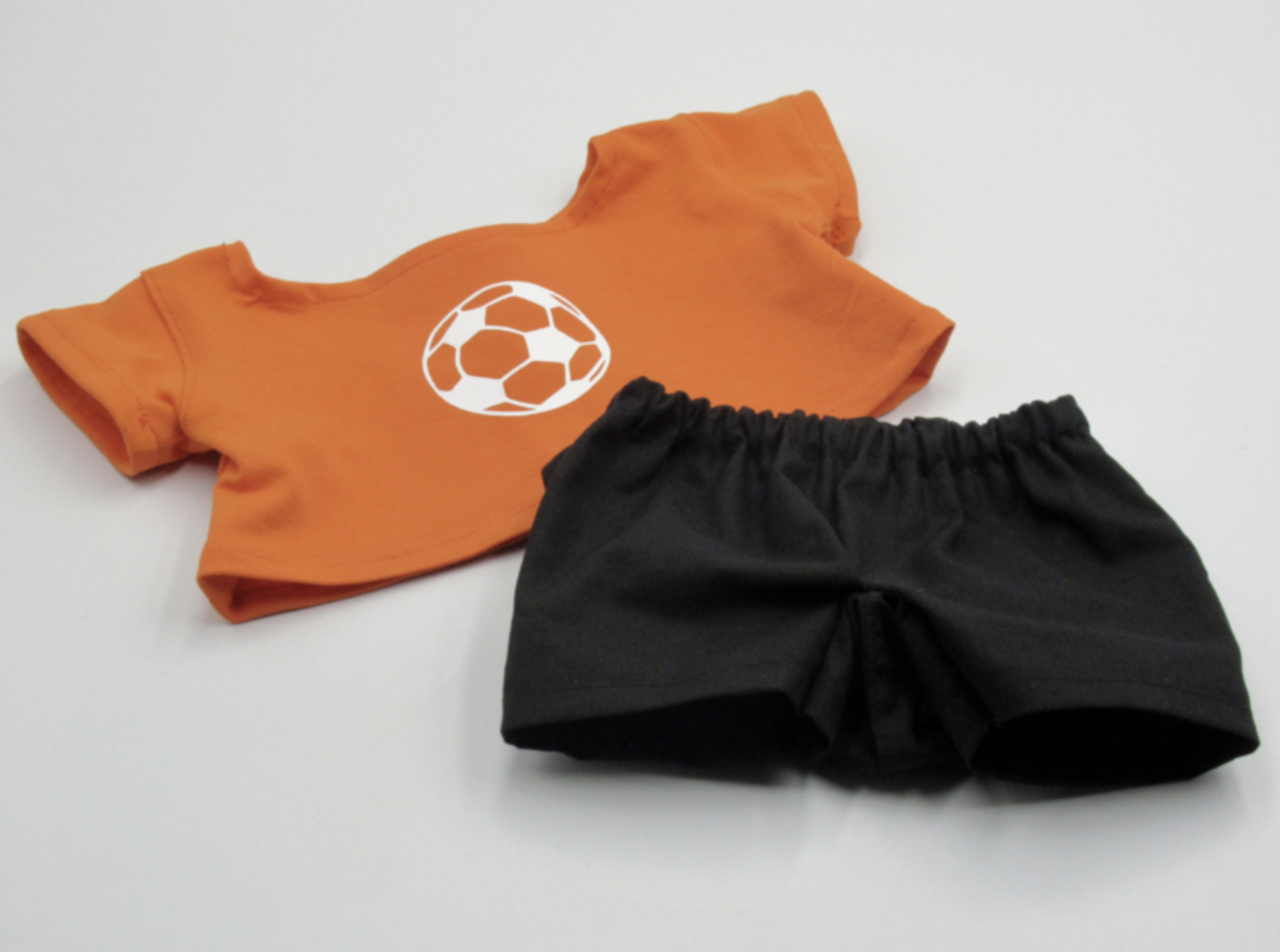 Een 2 delige voetbaloutfit in oranje en zwart. De set past op de handpop van 42 cm. hoog. Door een klittenbandsluiting op de rug, kan de handspeelfunctie gewoon gebruikt worden. je kunt de kledingset op 40 graden wassen.