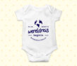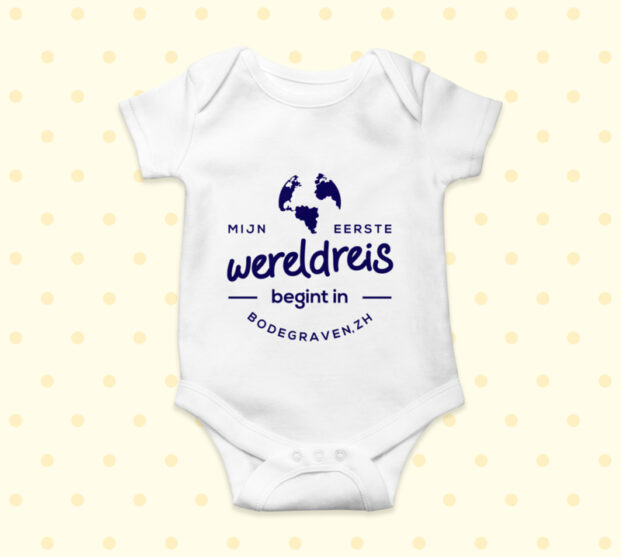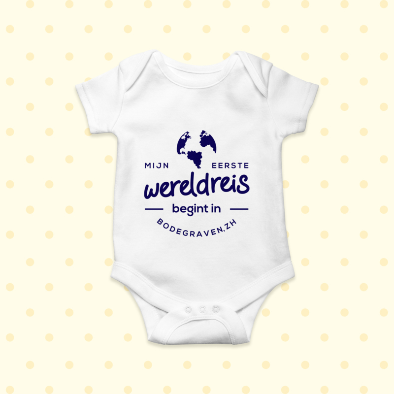 Een witte romper, verkrijgbaar met of zonder mouwtjes, met de opdruk 'Mijn eerste wereldreis begint in [plaatsnaam]'.  De romper is in diverse maten en verschillende kleuren te bestellen. Geef (of bestel voor je eigen wonder) een uniek gepersonaliseerd cadeautje.