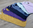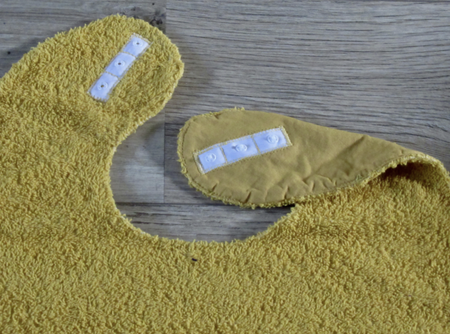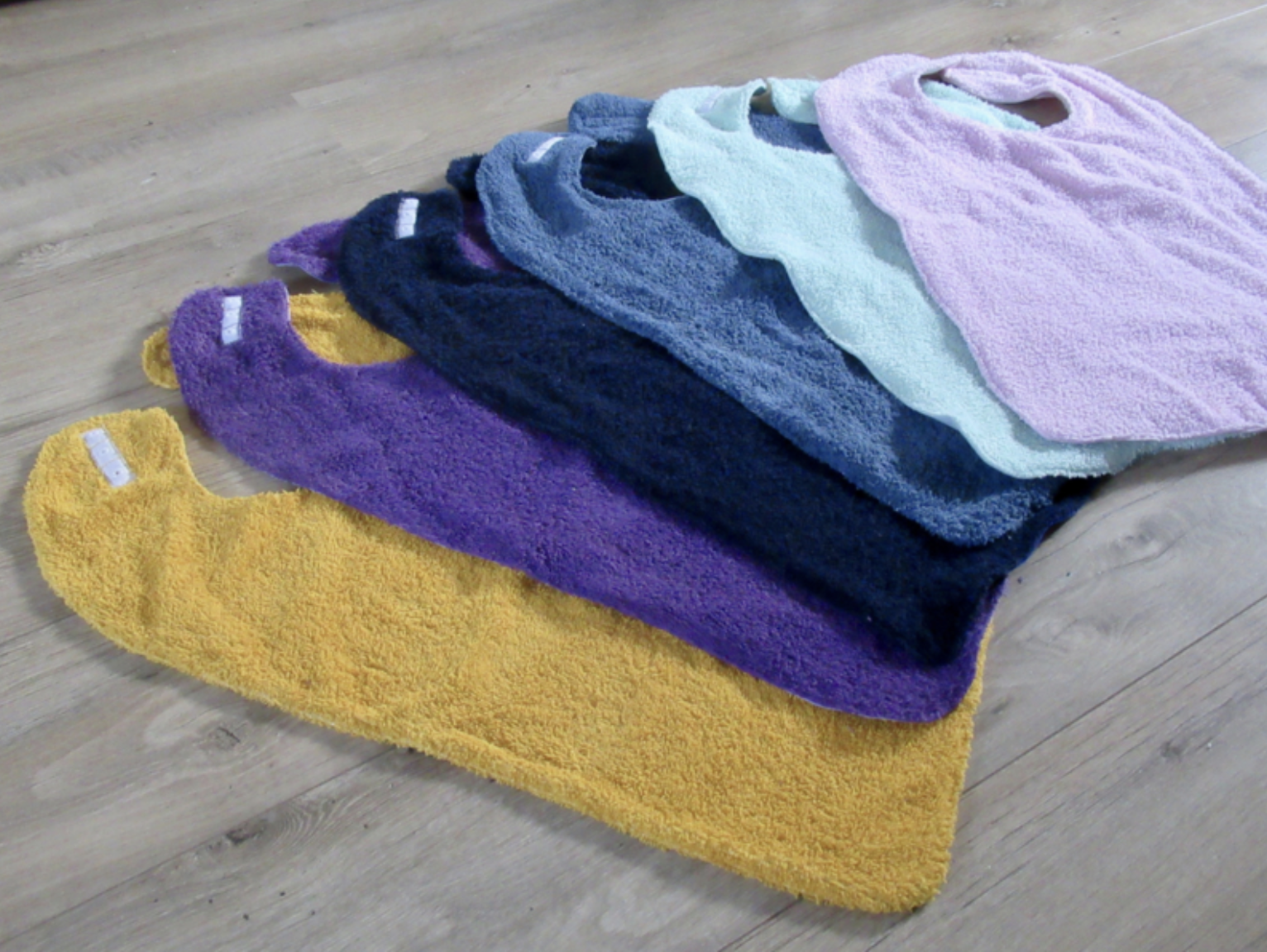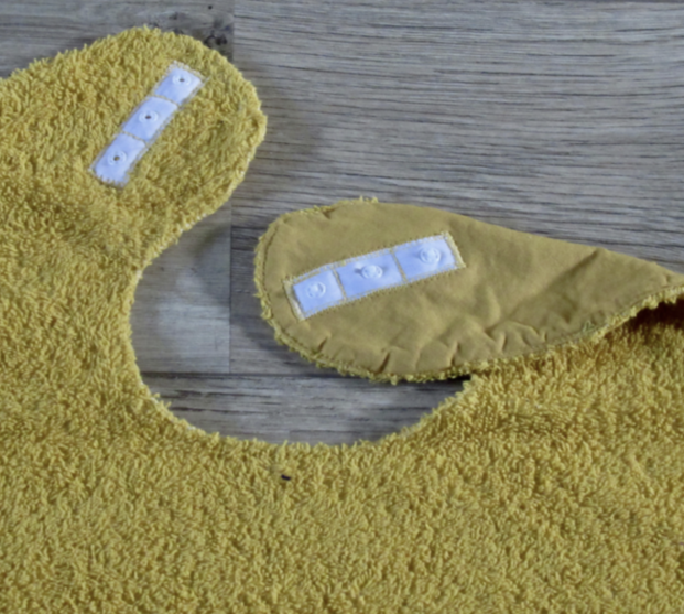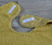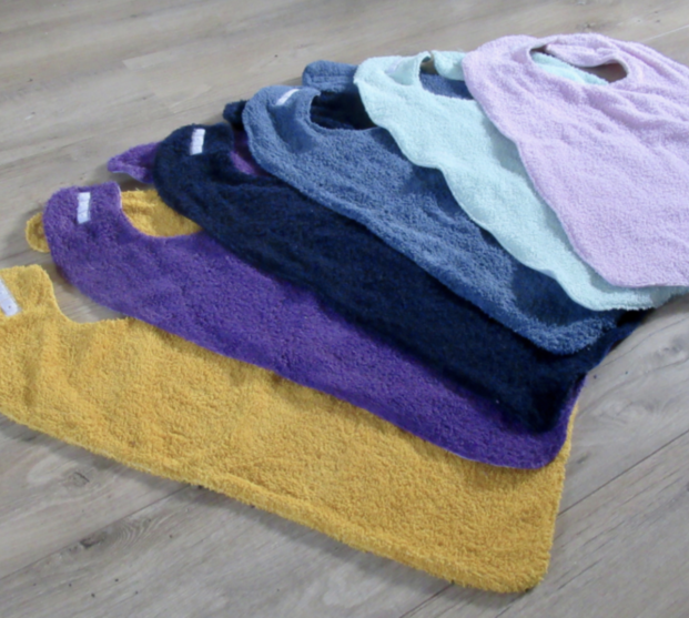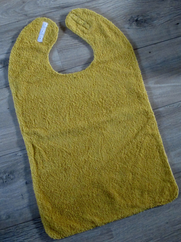 Van hals tot onderkant zijn ze 45 cm. lang en 39 cm breed. Ze zijn gemaakt van uni kleurige badstof met aan de achterkant een katoenen stof. De slabben sluiten met drukknoopjes.