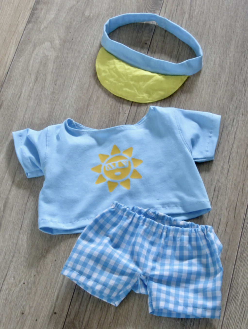 Zonneklep, shirt en korte broek, past op handpop Bobbi